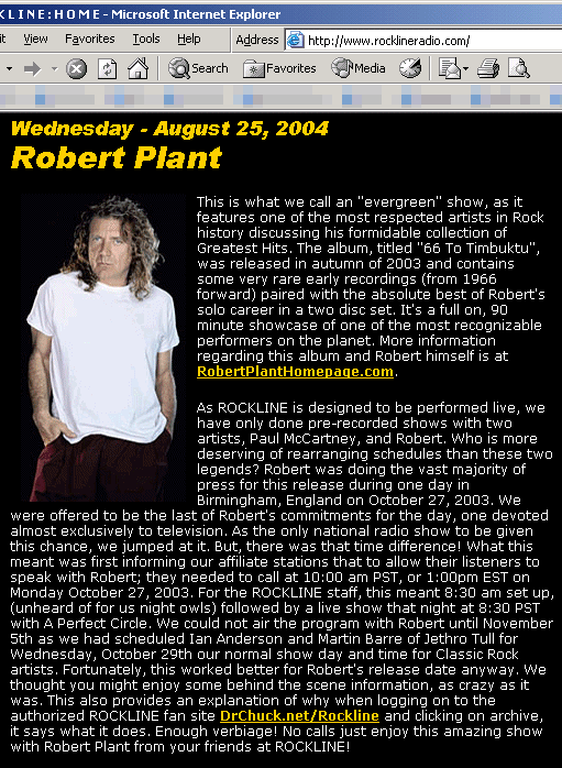 For years, I wondered when Rockline would get around to putting up their own official site. In February 2002, I stopped wondering. That was when their official website went online. For the first time, I didn't have to listen to the show to find out who was coming up the following week, I could just... go to their website. With this new turn of events, was my site still needed? I had things they didn't have, like a message board and a list of frequently asked questions (FAQ). I actually hadn't planned on running my website this long, as it only started out as an HTML learning tool. Still, visitors continued to come to the site, so I kept it going. In fact, the site morphed from an unofficial site to an authorized fan site, as shown in this screenshot with Robert Plant.